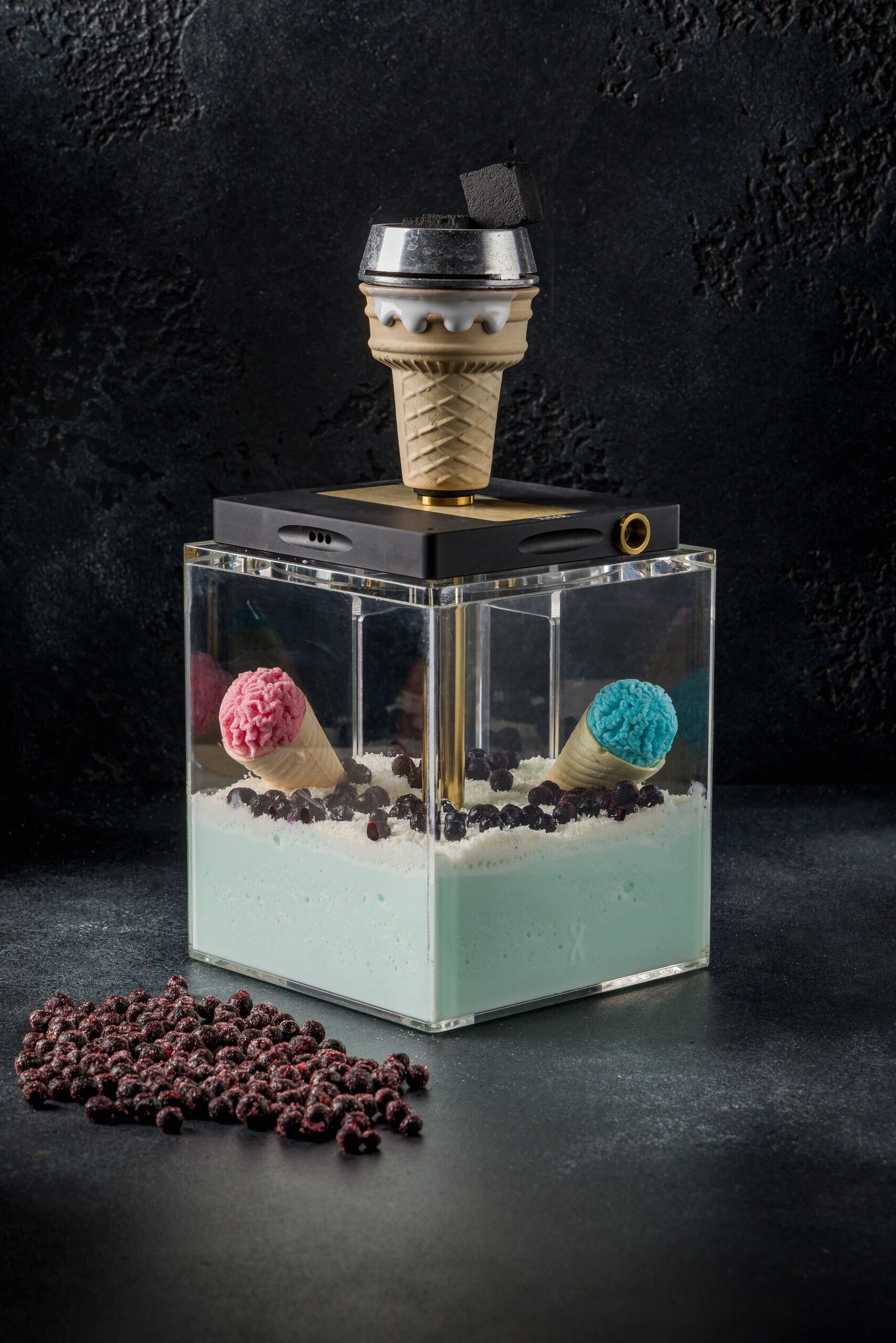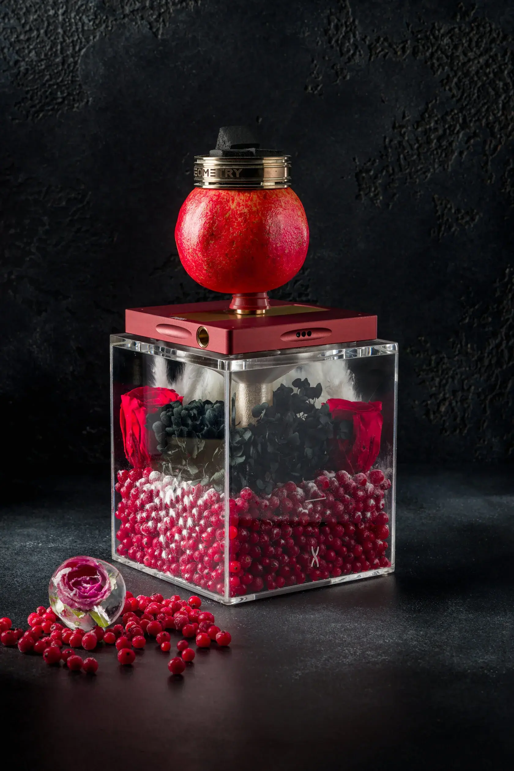 Кислая клюква в сахарной пудре и садовая малина в сочетании с бузиной и цветочными нотами жасмина и розы. Подается на чаше из граната.